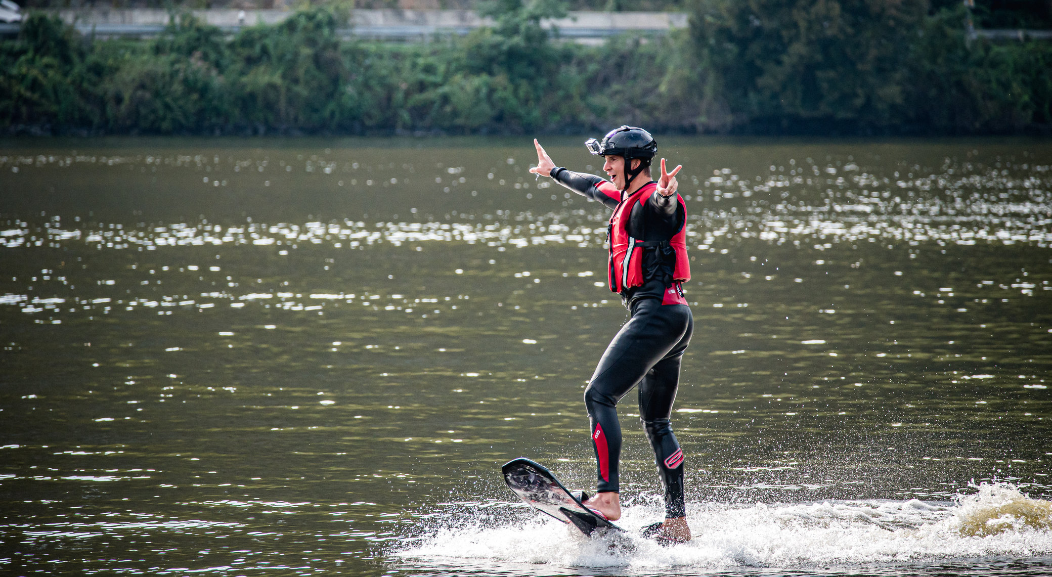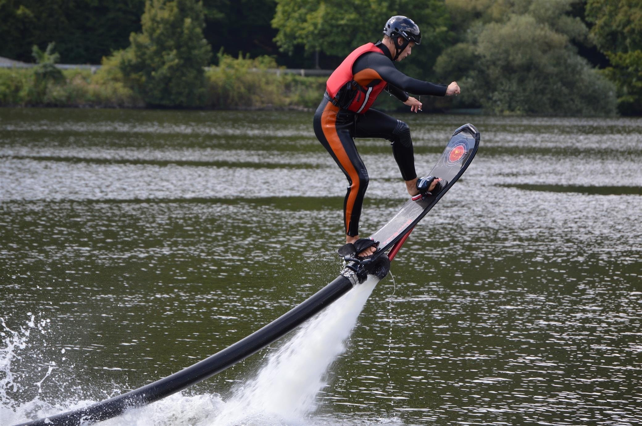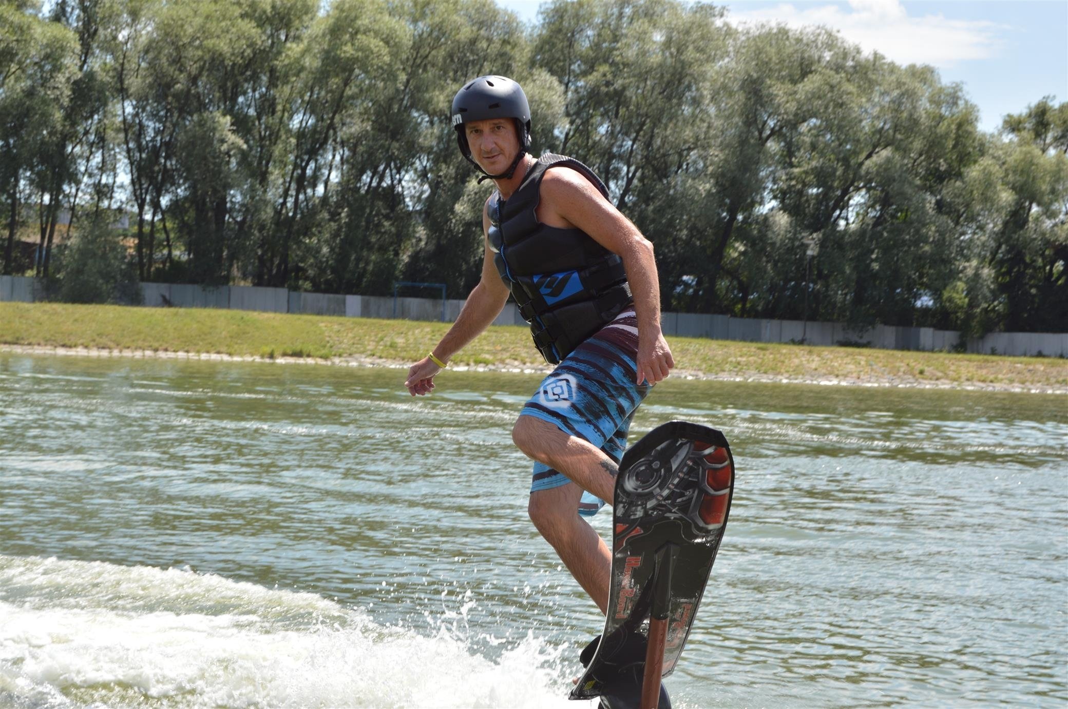 Potom sa oblečiete do neoprénu, plávajúcej vesty a prilby - a inštruktor vám odovzdá hoverboard. S ním skočíte do vody, zasuniete nohy do viazaní (pút) pod vodou, chytíte dosku za špičku a počkáte na silu prúdu. Prúd vody vás začne vytláčať z vody a vy sa snažíte udržať rovnováhu... a letieť. Je to celkom ako wakeboarding, ak vyštartujete z vody. A po niekoľkých pokusoch ste zrazu nad vodou a letíte... a zábava s hoverboardingom sa môže začať.