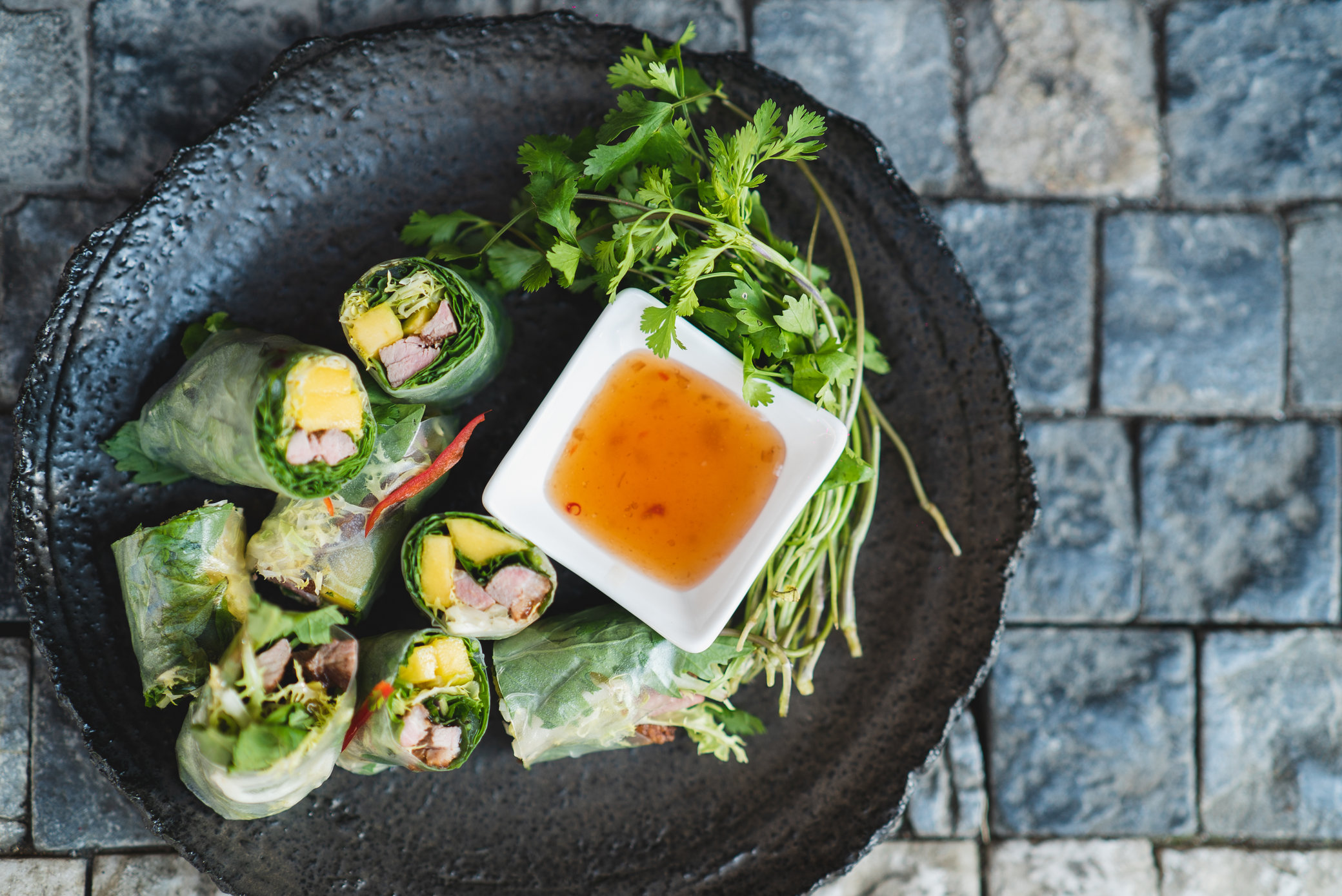 - Ebi tempura Summer Roll - tempura krevety, ryžový papier, šalát, mango, avokádo, tobiko kaviár, sezamový dresing mongo, wasabi a tagarshi dresing