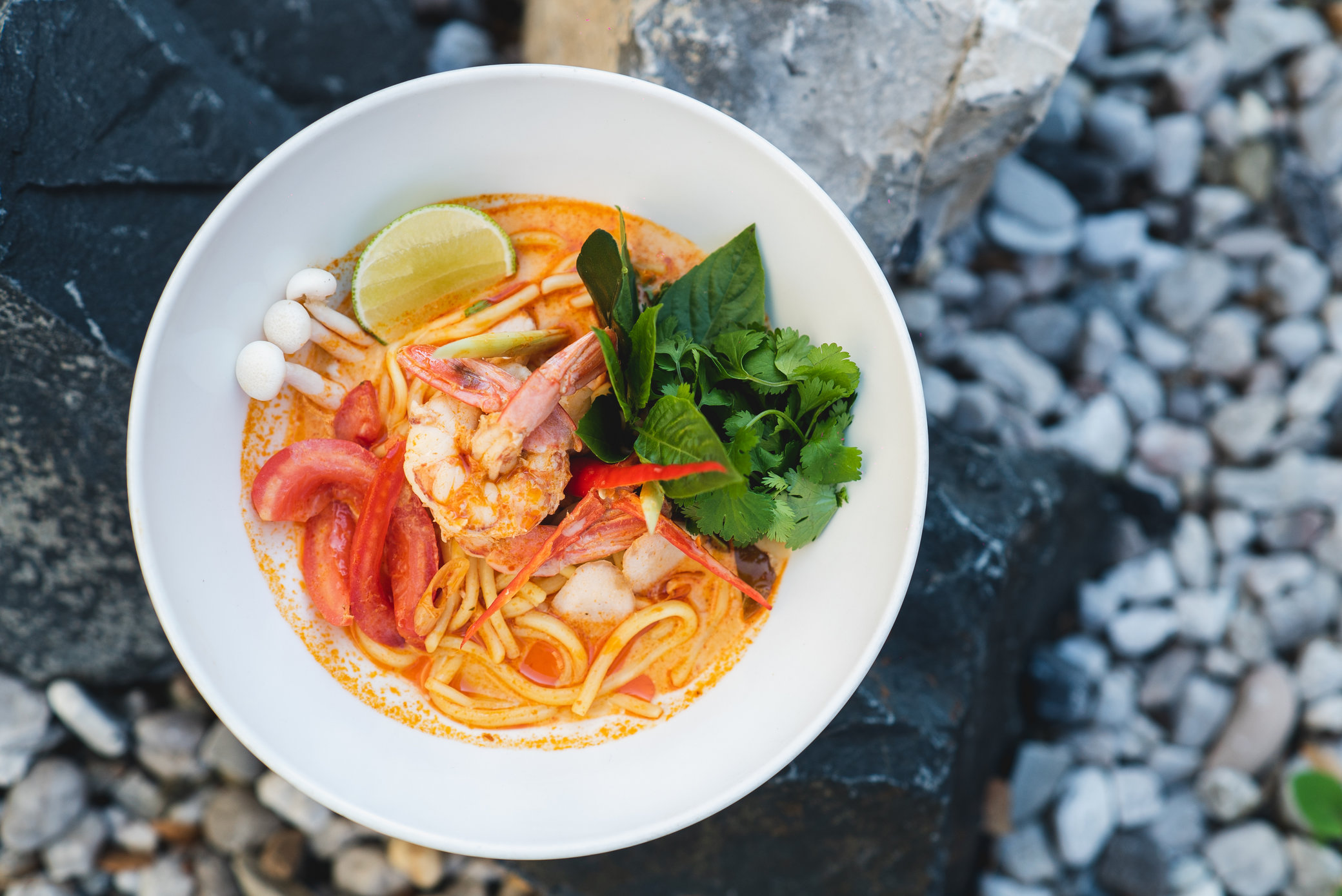 - Tom Yum Nam Prik Pao - tradičná pikantná polievka s krevetami, domácou chilli marmeládou, thajskou bazalkou, chilli, galangalom, citrónovou trávou, limetkovými listami, paradajkami, hubami, kodiandrom